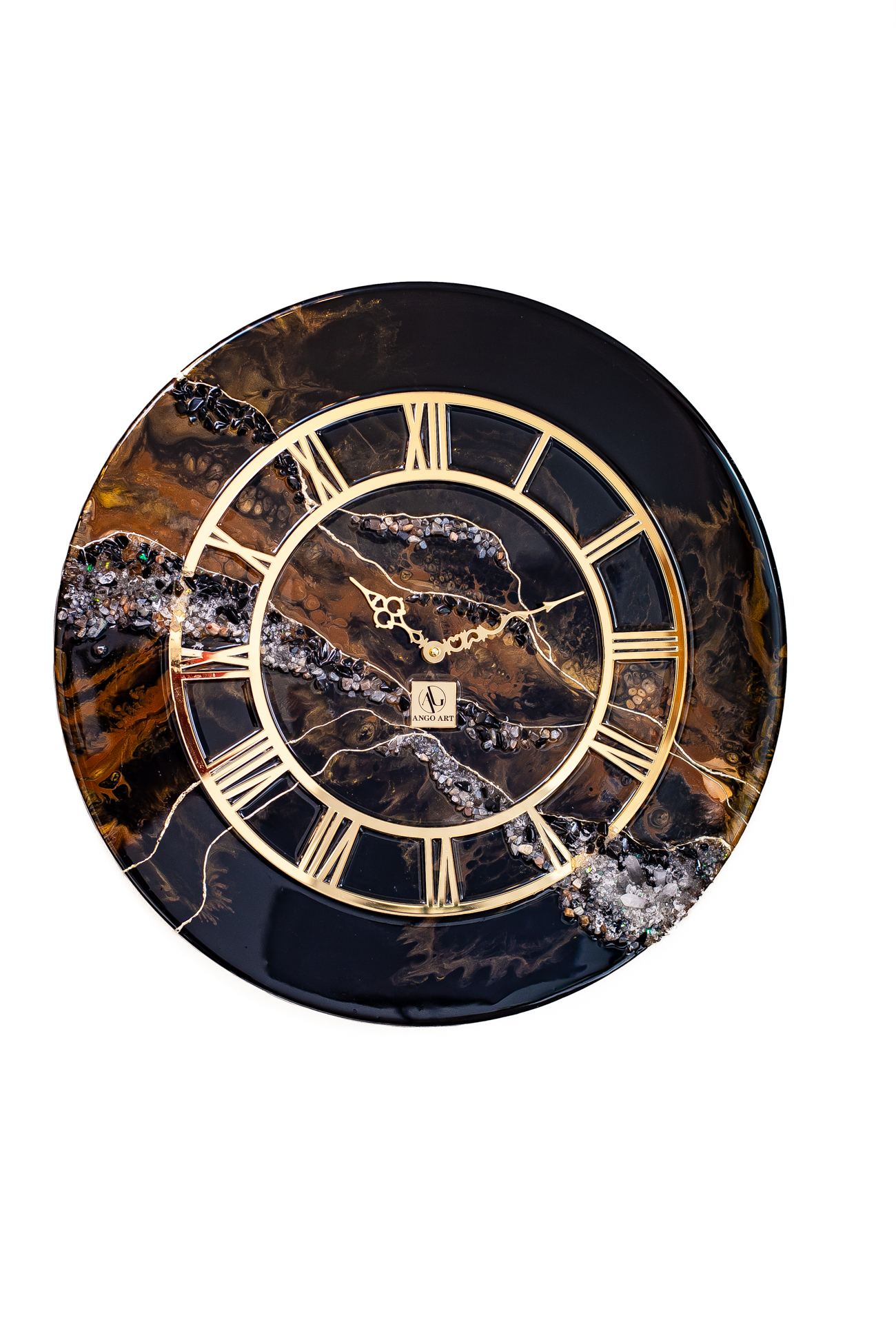 Niesamowity stylowy czarny zegar z połączeniem brązowych odcieni oraz złotymi żyłkami ma średnicę 50 cm. Dodatkowo zdobiony kamieniami naturalnymi, takimi jak czarny obsydian, kamień księżycowy oraz kryształy górskie. Każdy z tych minerałów ma swoją magię i moc.